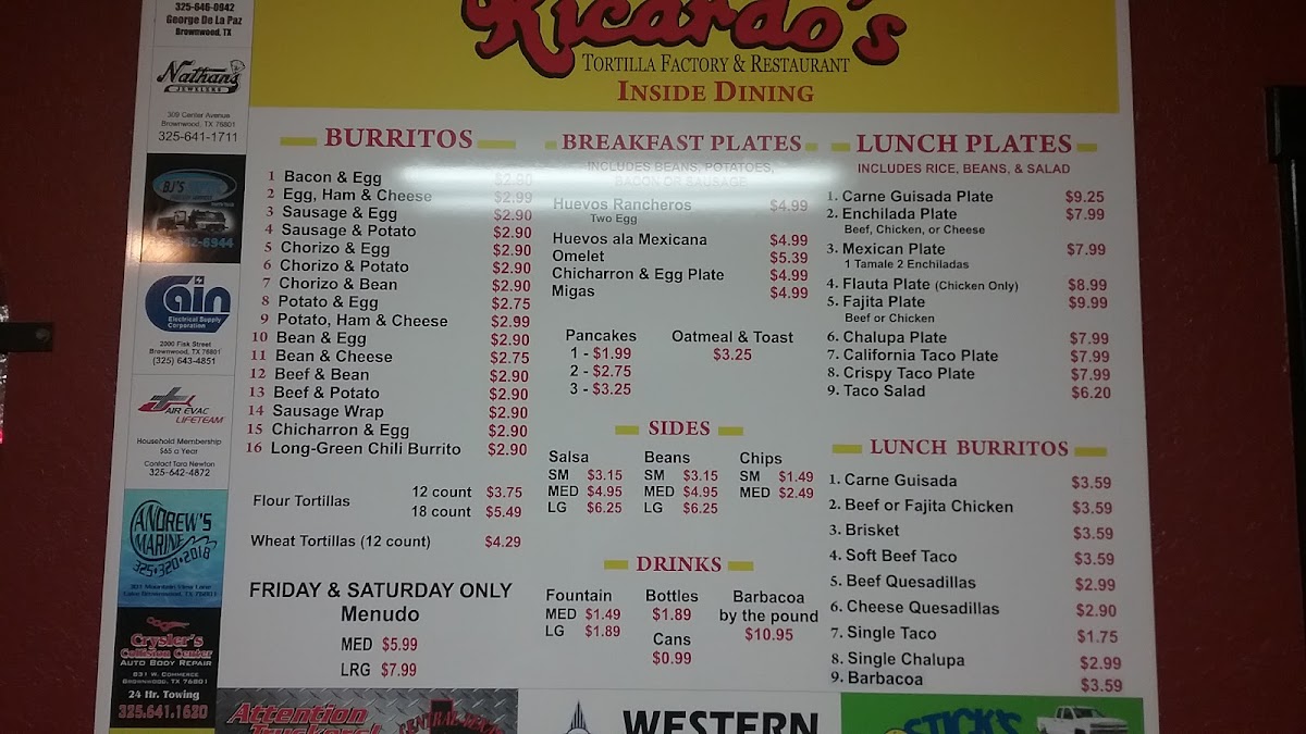 Welcome to Ricardo's Tortilla Bakery, your go-to destination for authentic Mexican flavors in Brownwood, TX. Known for their exceptional tortillas, this bakery offers a delightful array of breakfast burritos, including flavorful options like Chorizo & Egg and Bean & Cheese, each priced reasonably between $4.29 and $4.79.